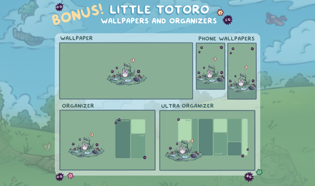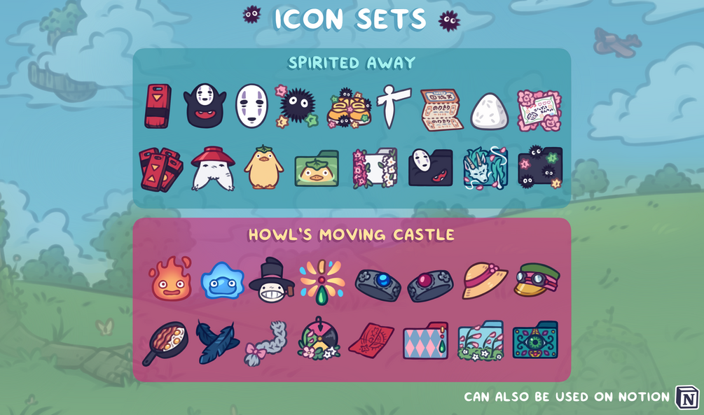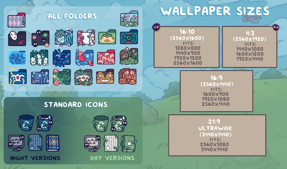 I adore Studio Ghibli and its beautiful worlds and characters, so I created this massive desktop set that includes as many beloved movies as I could, for anyone else who wants to bring some Ghibli magic to their desktop! ♥ Customize your icons, folders, shortcuts, and mouse cursor with matching wallpaper theme and clean up your desktop with the organizer wallpapers. This set can also can be used on Notion, anywhere you can put a picture, icon, or emoji ✧⊹