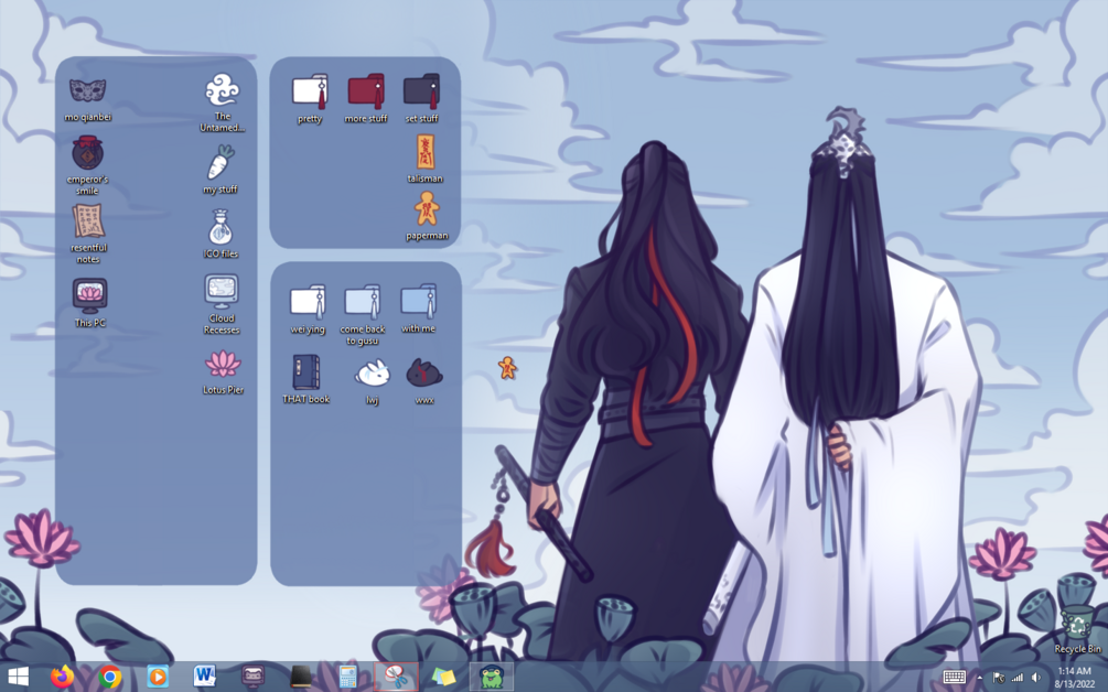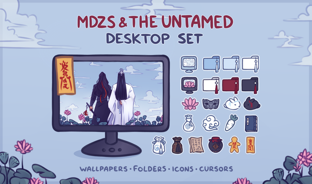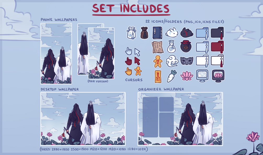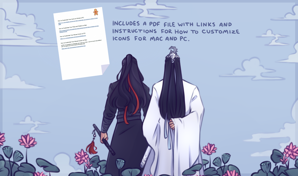 A mdzs/cql themed desktop set for if you are like me and this demonic cultivator and his husband have completely taken over your life and you would like them to take over your desktop as well! I drew this and have had it as my own background for months now and I figured there might be others out there would like it as well ^^ And of course with themed icons and folders, a little paperman cursor, phone version, and also a matching split phone wallpapers so you can match with your significant other, zhiji, friend, or your own home/lock screen! ;)
