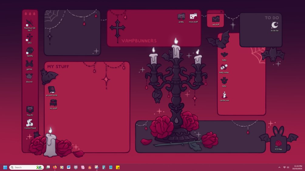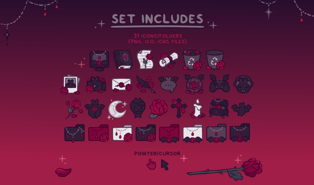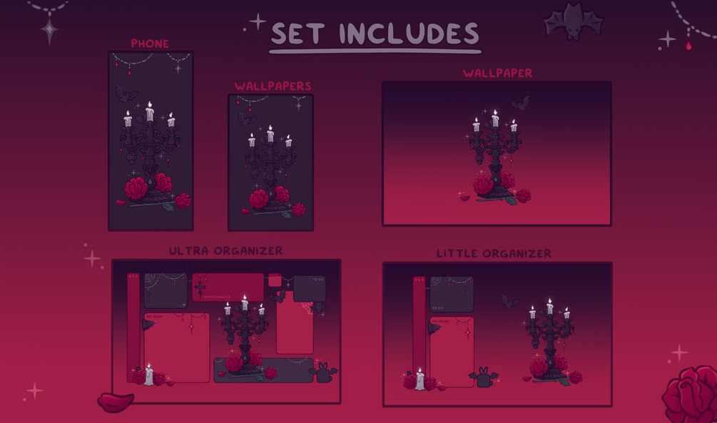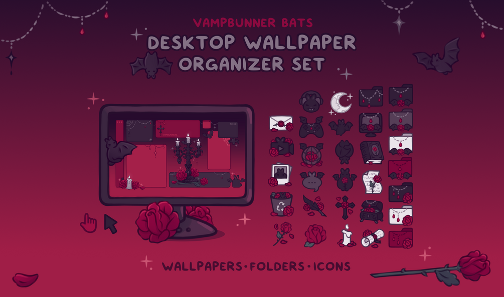 An adorable gothic and moody Vampbunner themed desktop set for anyone who would like to decorate their desktop with some dark candle-lit vibes and dramatic little vampire bunnies🩸🦇🐇🖤 Customize your icons, folders, shortcuts, and mouse cursor with matching theme and clean up your desktop with the organizer wallpaper ⊹₊✧ Helpful for: students, gamers, office workers, artists, writers, or anyone with a computer! <3