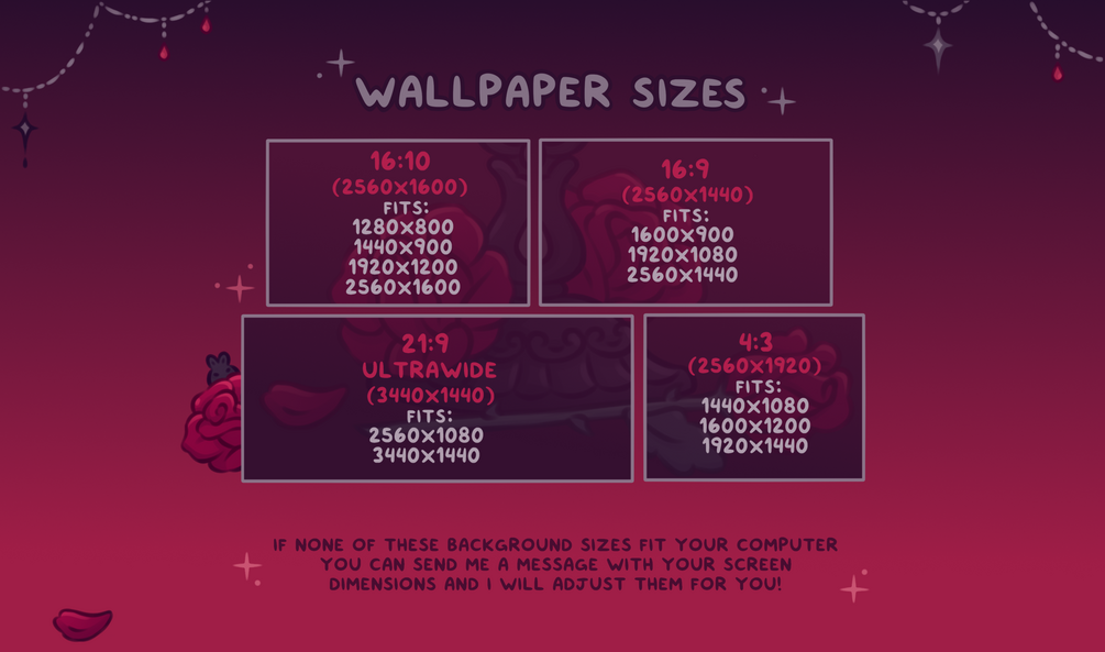If none of these background sizes fit your computer - you can send me a message with your computer screen dimensions and I will adjust them for you! ^^ You can message me on instagram @immabunnishop or email me at immabunni@yahoo.com
