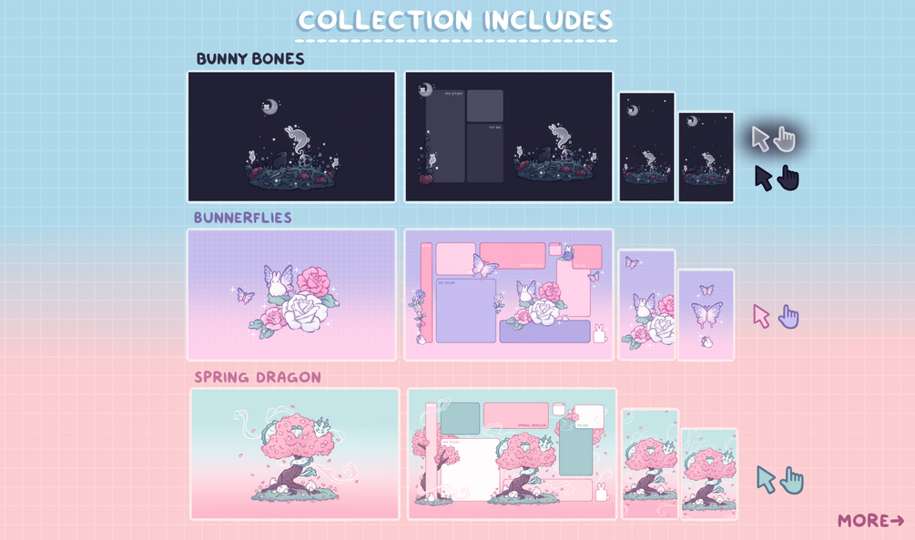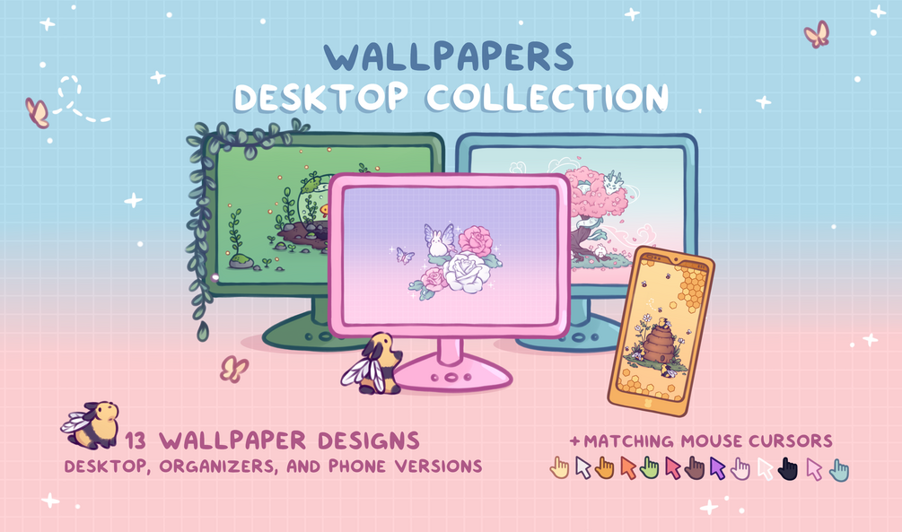 A collection of all the desktop and phone wallpapers/organizers (and mouse cursors) from my assorted Wallpaper Background Sets - for anyone who might appreciate some overall cute, miscellaneous, fantasy themed wallpapers to help organize or decorate your desktop.✧・゚✧*:・゚✧