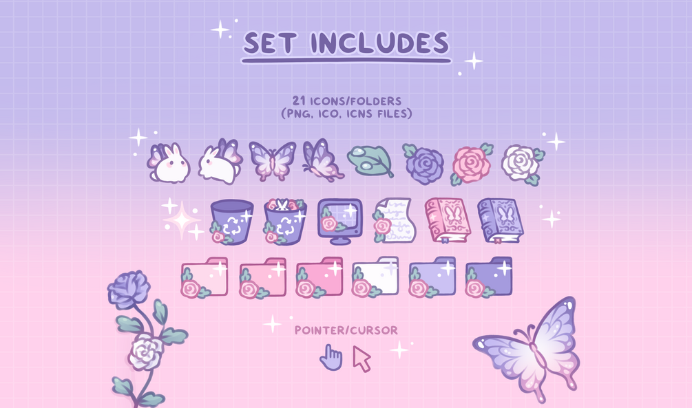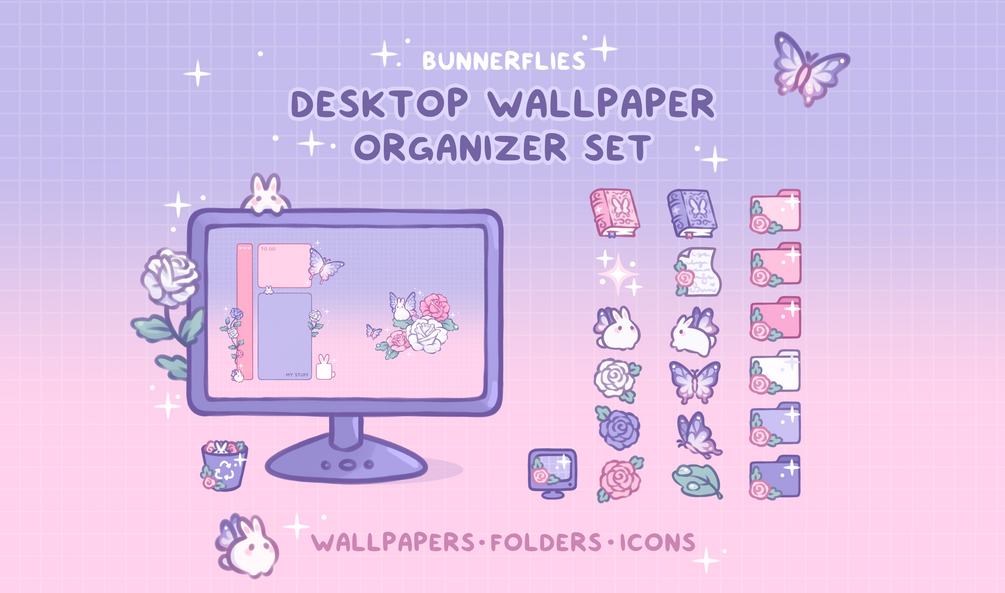 A sweet and lovely bunnerfly themed desktop set for anyone like me who would love some sparkly fairy bunnies on their desktop! ✨🐇🌸 Customize your icons, folders, shortcuts, and mouse cursor with matching theme and clean up your desktop with the organizer wallpaper ⊹₊✧