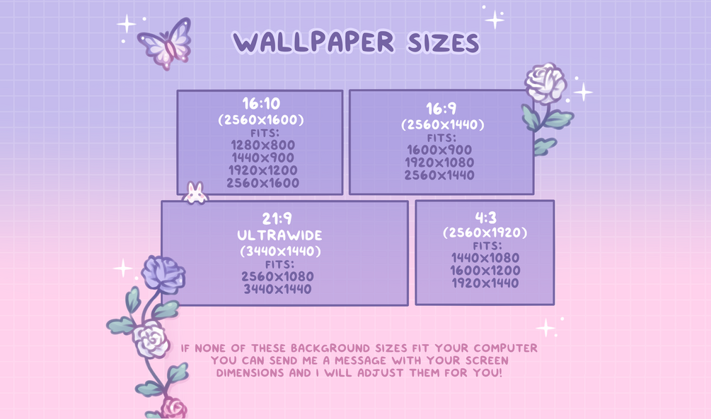 If none of these background sizes fit your computer - you can send me a message with your computer screen dimensions and I will adjust them for you! ^^ You can message me on instagram @immabunnishop or email me at immabunni@yahoo.com