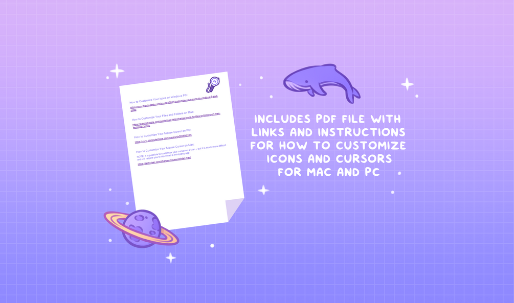 This set is compatible with both Mac and PC but a note for Mac users: it is more difficult to change the mouse cursor compared to PC - it is possible but you will need to download a third party app to customize your cursor. Instructions on how to do this are linked in the PDF. But besides that, everything else it easily compatible with both ✩