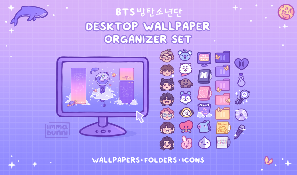 A BTS desktop set for any other armys who would like to decorate our lives just a little more with adorable BTS merch (your desktop is free real estate). Customize your icons, folders, shortcuts, and mouse cursor with all your favorite members, bt21 cuties (with unmasked Mang!), and various other bangtan items - and clean up your desktop with the organizer wallpaper.